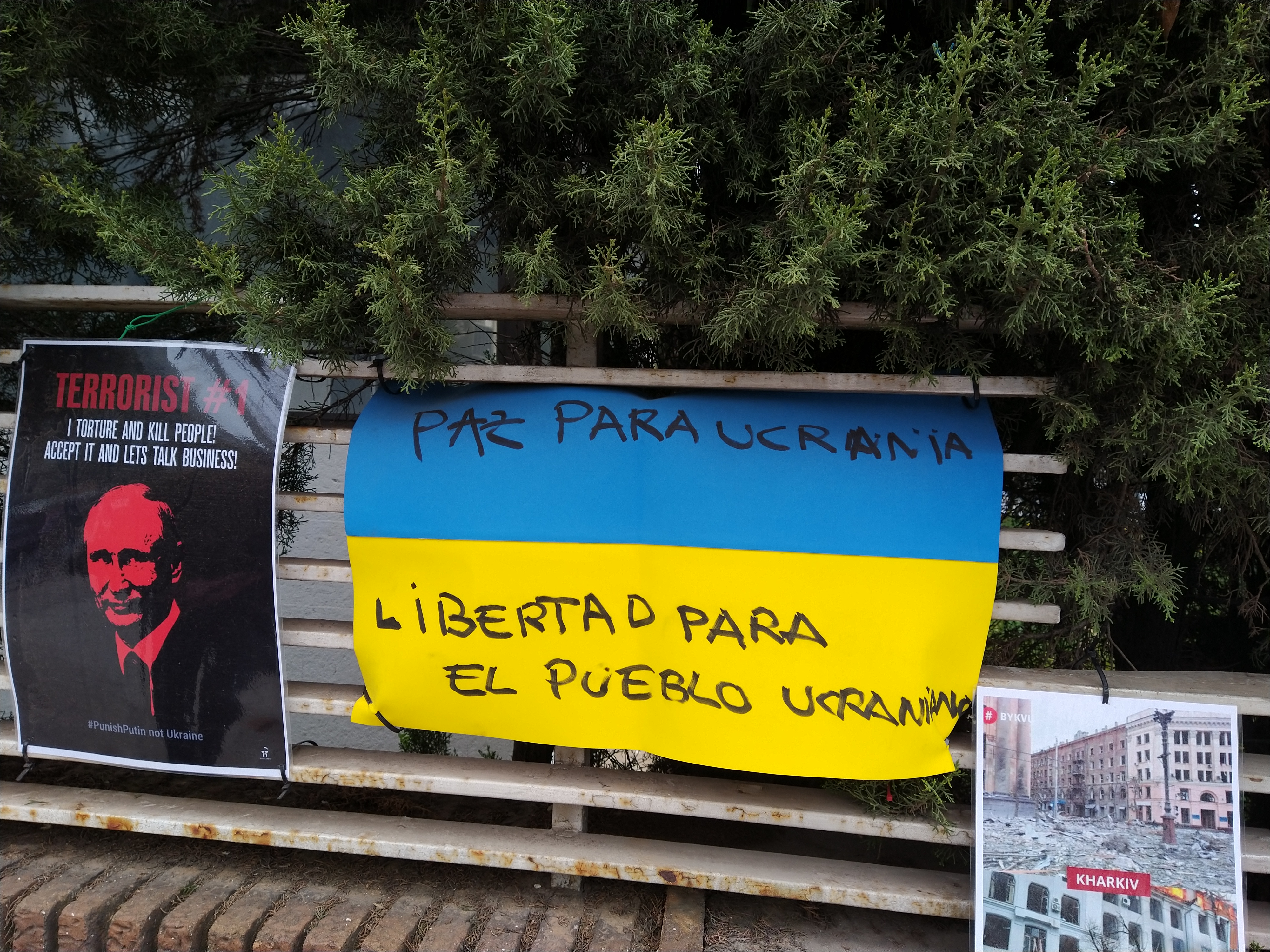 En la acera frente a la fachada de la Embajada había varias personas concentradas, la mayoría mujeres. Algunos de los carteles y símbolos que las acompañaban, junto con fotos de los efectos de los ataques sobre la población civil ucraniana: